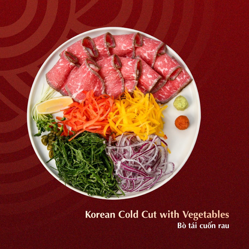 Một món ăn vừa đẹp mắt vừa mang ý nghĩa tốt lành, bò tái cuốn rau là sự hòa quyện giữa thịt thăn bò tái mềm ngọt, giữ nguyên độ tươi hồng, cùng với bốn loại rau củ tượng trưng cho bốn mùa Xuân – Hạ – Thu – Đông. Món ăn này không chỉ bổ dưỡng mà còn mang đến sự hài hòa về phong thủy, giúp khởi đầu năm mới thêm khí thế và may mắn.