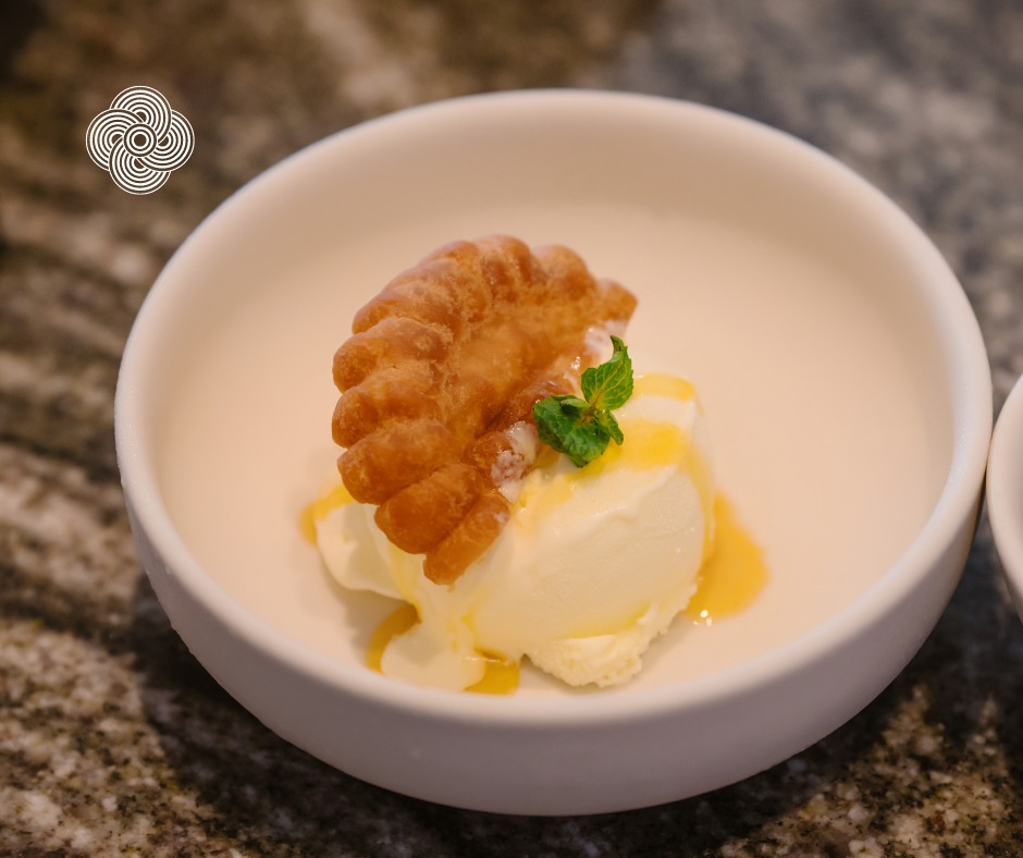 Kết thúc bữa ăn bằng kem vani hand made béo ngậy kết hợp cùng bánh Yakgwa truyền thống ngọt ngào sẽ giúp thực khách cân bằng lại vị giác.